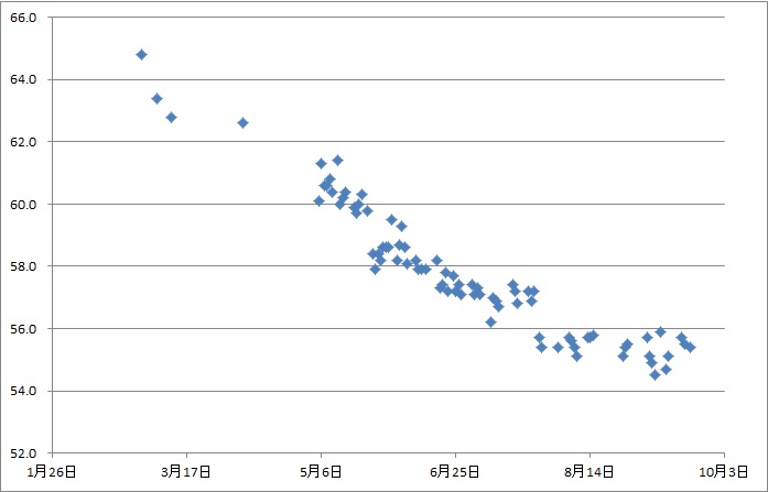 体重のエラーバーはどれくらいなんだろうか? ±1kgは平気で動きそうなきがする。「夜風呂あがり」という極力計測条件を揃えてはいるが。